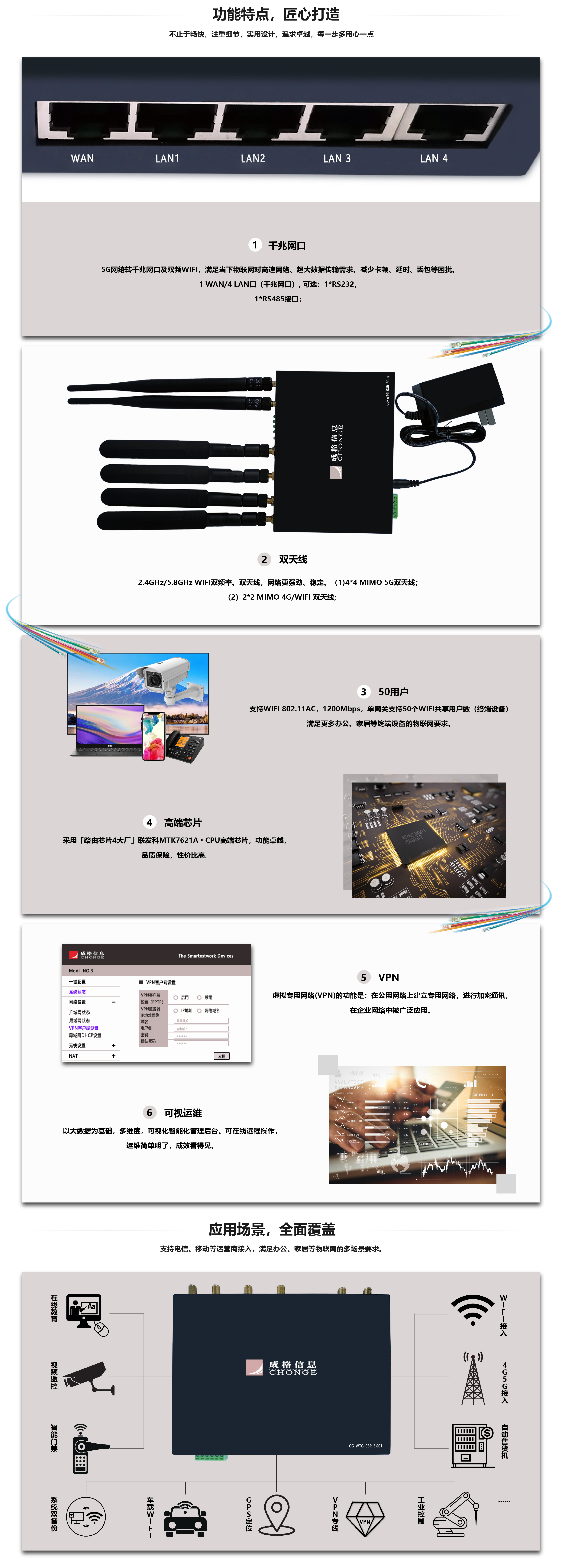 CG-WTG-08R-5G01工業路由器/網關,是基于5G蜂窩技術和(hé)Wi-Fi網絡技術開發的(de)無線高(gāo)速工業路由解決方案。支持工業設備數據采集、髒數據清洗,協議解析、邊緣計算,多平台數據傳輸,支持VPN及數據加密傳輸。即插即用的(de)數幹兆比特連接方案替代DSL、有線和(hé)光纖部署,實現傳統工業設備互聯互通行業的(de)變革,為(wèi)智能制造提供可(kě)靠技術解決方案。