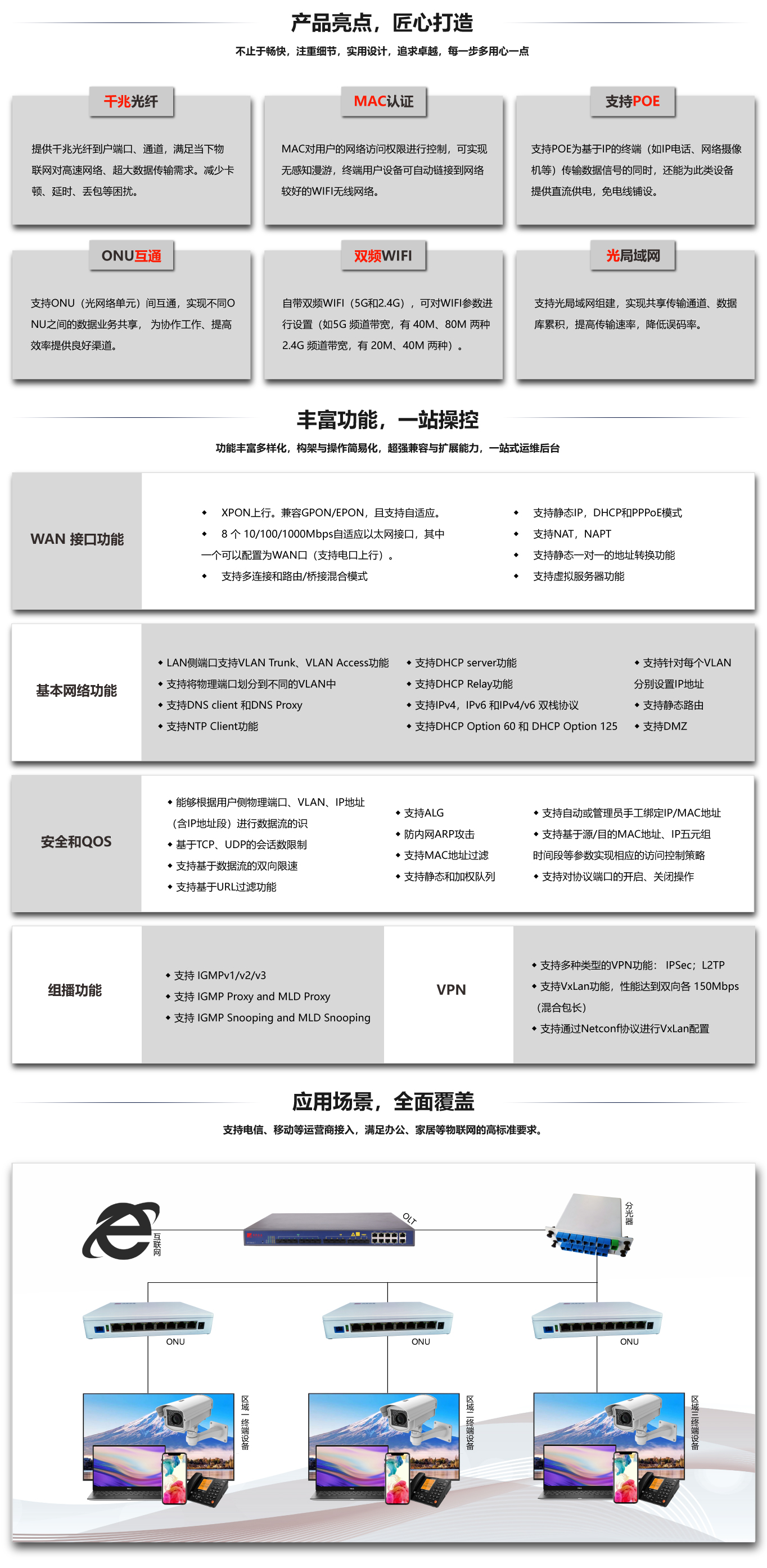 CG-WTG-08-OR88P具有 8 個千兆 LAN,支持 POE;自(zì)帶雙頻 WIFI,支持 802.11ac;WIFI 支持統一(yī) SSID,支持漫遊功能;支持ONU 間互通,組建光局域網。