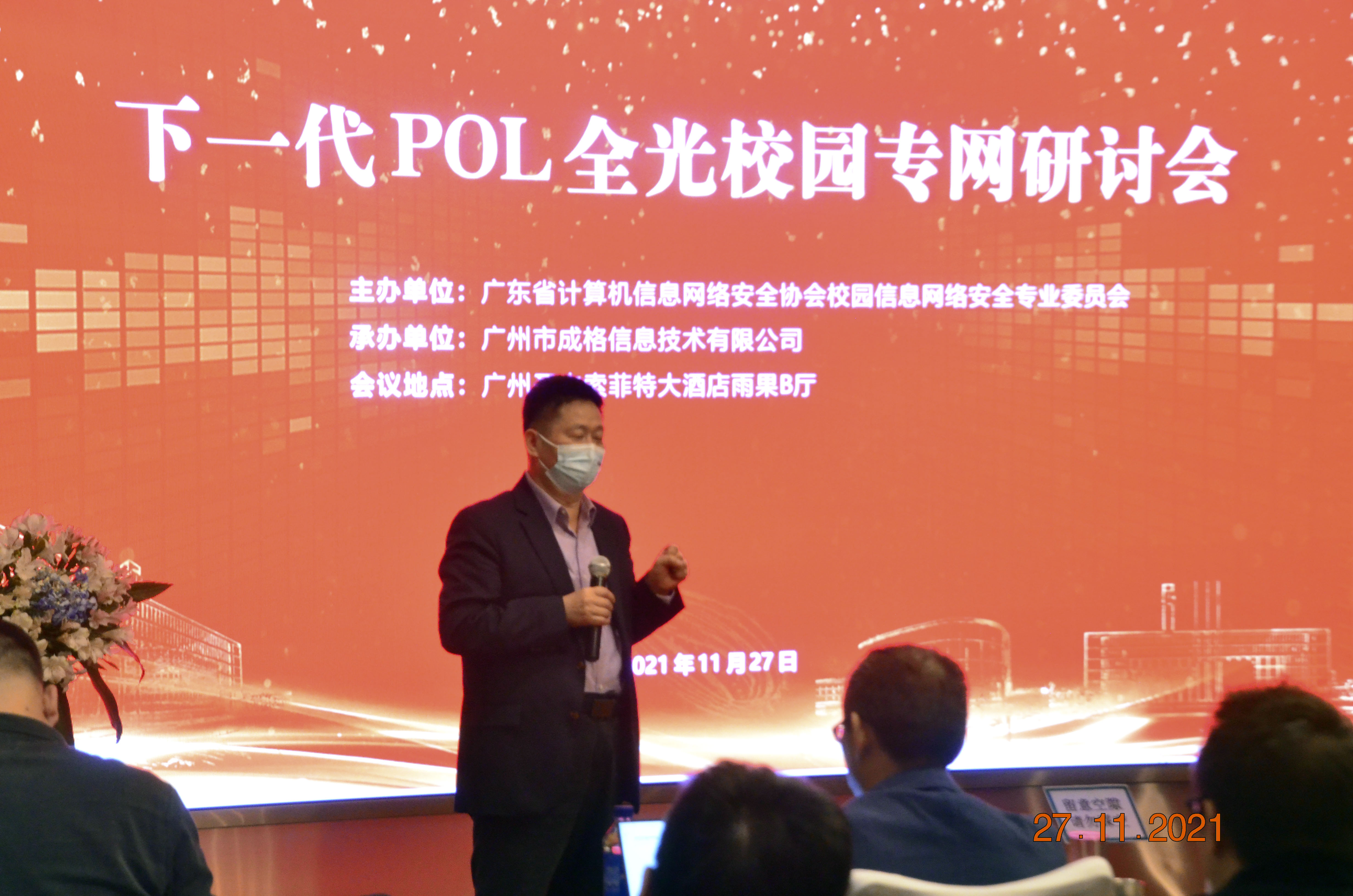 11月27日下午,由廣東省計算機信息網絡安全協會校園信息網絡安全專業委員會(下稱:專委會)主辦,廣州鉑希納信息技術有限公司(下稱:成格)承辦的(de),以“下一(yī)代POL全光校園專網”為(wèi)主題的(de)學(xué)術研讨會如(rú)期召開。