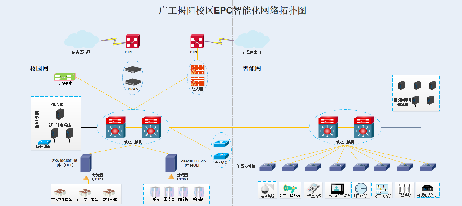 智能化專網主要服務于視(shì)頻監控等系統等七大系統:廣播系統、視(shì)頻監控系統、停車場管理(lǐ)系統、可(kě)視(shì)對講系統、時鍾系統、一(yī)卡通系統、有線電視(shì)系統。智能化專網采用傳統接入—彙聚—核心的(de)方式,對智能化專網與校園網進行物理(lǐ)隔離(lí)。